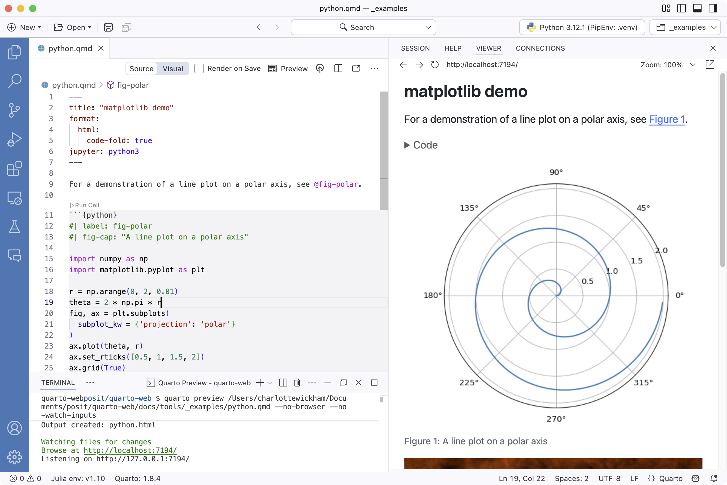 The Quarto extension also works well with other extensions bundled with Positron, like Jupyter extension, and those you might install separately, like the Julia extension.